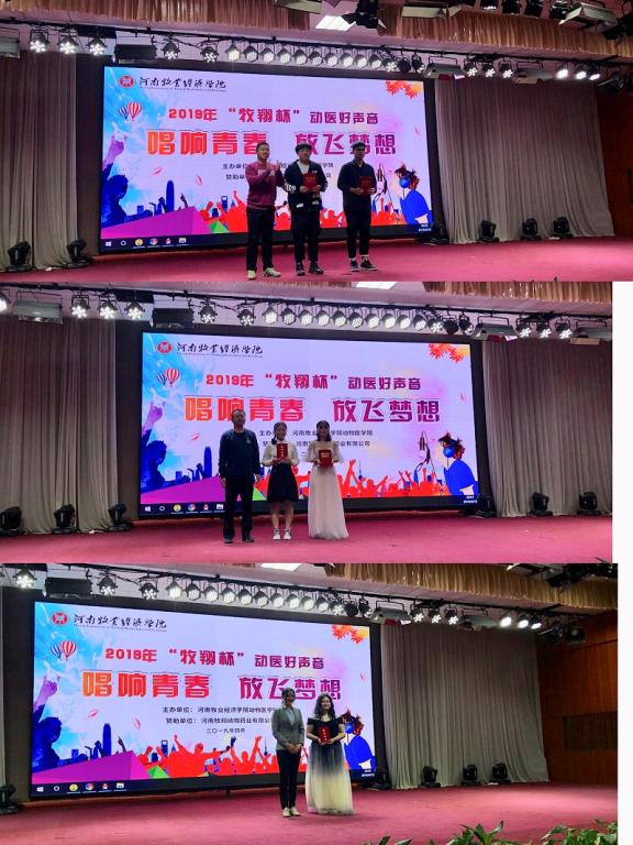 4月12日19:00,动物医学院河南牧翔动物药业有限公司于大学生活动中心四楼举行2019年“牧翔杯”动医好声音歌唱比赛。河南牧业动物药业有限公司人事部王菲菲女士、我院党总支副书记张瑞春、团总支书记王宏魁、辅导员张丽、聂丹、付文凯老师于450余名学生共同参与了此次活动。