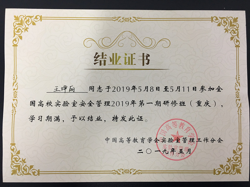 2019年5月8日-11日,由中国高等教育学会实验室管理工作分会主办,由北京大学承办,重庆大学协办的“全国高校实验室安全管理2019年第一期研修班”在重庆举办。此次研修班旨在深入贯彻与落实国务院、教育部关于加强高校实验室安全工作的意见,提高各高校实验室安全管理及防控能力。来自全国的近200所高校500余名代表参会。我院实验教学管理中心主任郭素琴和实验教师王坤丽参加了本次研修班的学习培训。