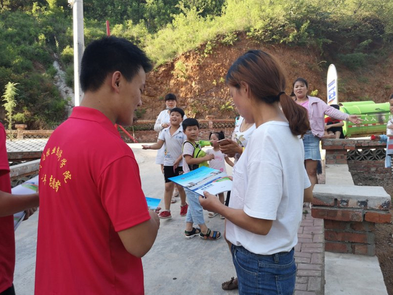 宣讲过程中得到了广大村民的支持,不仅认真的回答了我们提出的问题并且还提出了一些自己的看法。随着国家对于生态环境的重视,近两年不仅在进村道路沿线安装了路灯,还配置了垃圾桶、垃圾箱,聘任专职保洁员每天将村庄内的垃圾运往乡垃圾中转站,确保生活垃圾在村内滞留期不超过两天,同时在山顶安装了大面积的太阳能光伏发电机、风力发电机,将太阳能、风能转化成电,这样又省资源又促进当地的经济发展。整个村庄整洁有序,村内民风淳朴,生活怡静,处处实现了“蓝天、碧水、绿地”的人与自然的和谐之美。在环保宣讲之后,队员们将携带的招生宣传手册发放给大家,向他们介绍河南牧业经济学院,如果亲戚朋友的孩子正在填报志愿,欢迎他们报考牧院。