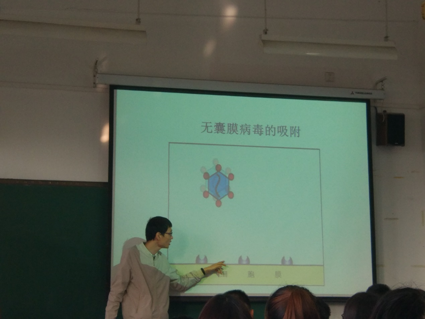 董老师授课内容是《兽医微生物及免疫学技术》课程中的病毒复制及干扰现象与干扰素等内容。董老师以当下流行病毒猪瘟病毒为切入点引出授课主题病毒复制的过程,主动引导学生们积极思考问题,极大的调动了学生的学习积极性,取得了良好的教学效果;随后董老师讲授了干扰现象与干扰素内容,其授课理论联系实际案例,使学生更加易于理解。课后经过与听课老师的交流,强化了年轻老师的教学能力和教学方法,取得了良好的交流效果。