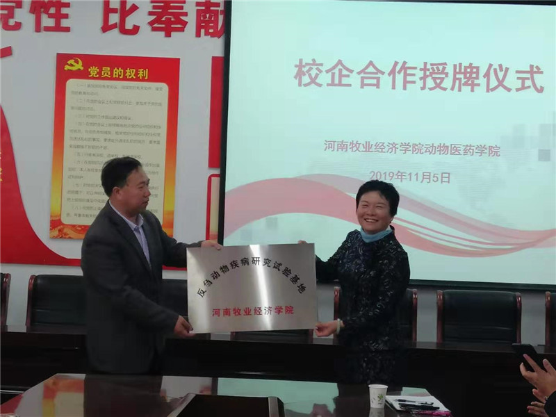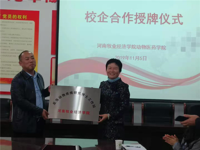 李利红副院长首先对两位专家的到来表示热烈的欢迎,随后介绍了太阳成集团tyc33455的师资队伍、学科建设、专业建设、校企合作,以及学生培养等方面的基本情况。紧接着,举行了授牌仪式,石冬梅教授为河南省奶牛生产性能测定中心张震主任颁发了“反刍动物疾病研究博士工作站”匾牌,为河南花花牛畜牧科技有限公司王相根总经理颁发了“反刍动物疾病研究试验基地”牌匾。