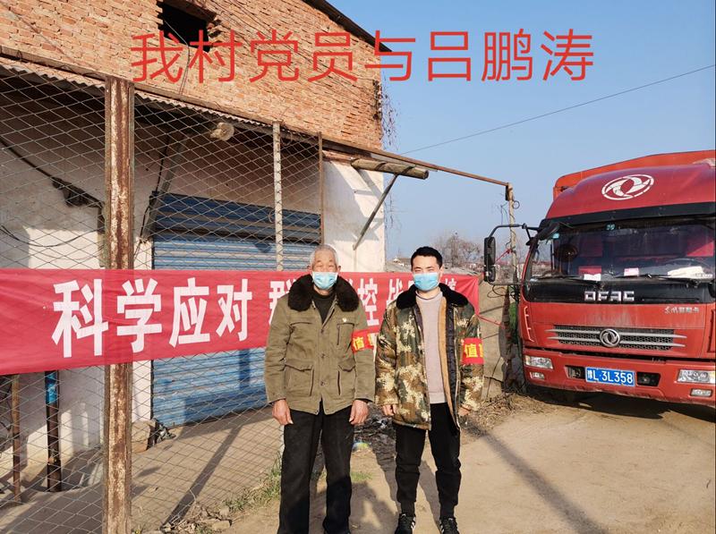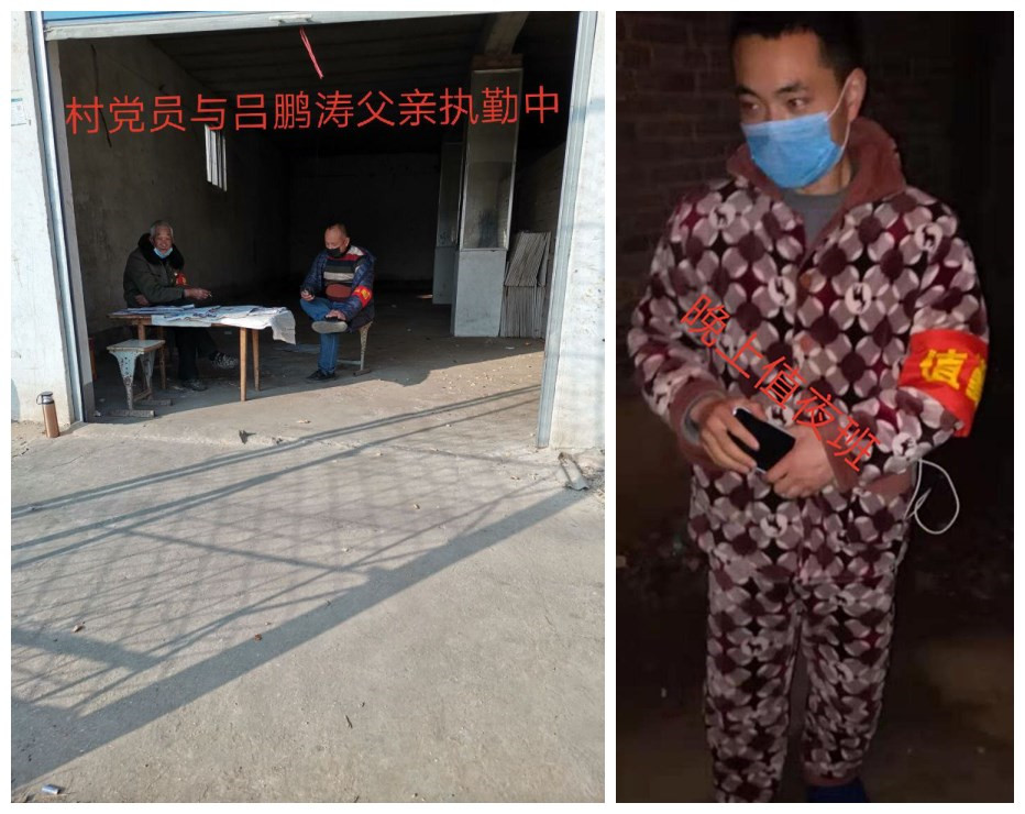 吕鹏涛作为一名预备党员,深知一个党员就是一面旗帜,疫情来临,刻不容缓,要充分发挥党员先锋模范带头作用,毅然冲锋带头参加本村的防疫工作,做到不畏惧,不退缩。在吕鹏涛的带领下,其父也开始参与到疫情防控工作中,从初二到现在,吕鹏涛的父亲两点一线,在家里匆忙吃过饭后就是去执勤一线,每天坚持为村民分发消毒液,心连心拉起一条安全线,筑起一堵村民安心墙。