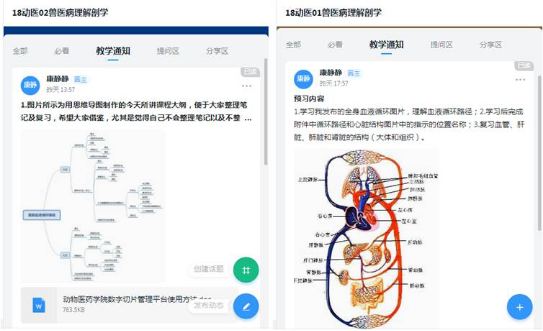 如兽医病理学课题组康静静老师通过“学习圈”提前发布各项学习资料,并指导预习;直播上课时,通过“标记书写”功能帮助学生更好的理解课程内容,并通过“互动面板”功能与学生进行提问互动。