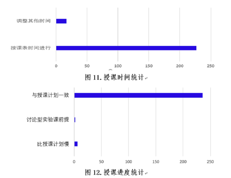 任课教师主要使用超星学习通、云班课、钉钉、微信、中国大学MOOC等以及多平台共用;授课形式以线上自主+多形式互动、直播+研讨、慕课+录播为主,个别课程使用自主学习+多形式互动、网络课堂等;90%课程按照课表执行;除个别课程进度比授课慢和个别讨论型实验课提前外,93%的课程进度与授课计划一致。任课教师所采用的授课平台、所使用的授课形式统计、授课时间、授课进度结果分别如图9、图10、图11、图12所示。