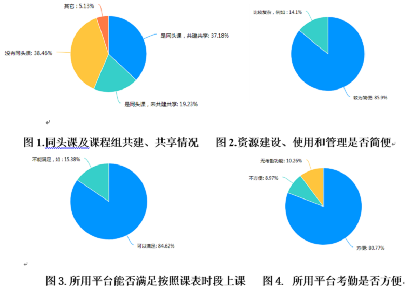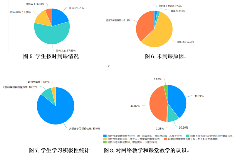 我院理论和理实一体任课教师共84人,每位教师限做1份调查问卷,收回有效问卷78份,数据具有代表性和普遍性。调查问卷反馈情况如下:2/3的同头课实现了课程组共建共享,1/3的同头课各自建课,如图1;教师对网络平台接受度教高,85.9%教师认为平台操作较为简便,如图2;所用平台基本能满足按照课表时段上课,少部分不能满足的主要原因是网络卡顿,如图3;大部分平台考勤都较为方便,按时到课率达在90%以上,迟到或未到课同学大部分因为网络卡顿问题,如图4、图5、图6;85.9%教师认为学生学习积极性高,少部分老师认为网络卡顿及学生自律性不高造成学习积极性不高,如图7;90%以上教师认为网络教学和面授教学各有千秋、相得益彰,可相互配合使用,只有极少数教师不建议采用网络教学方式,如图8。
