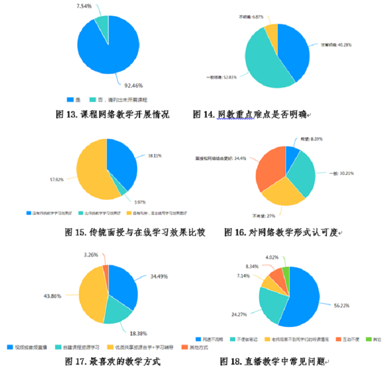 本学期有课班级总人数为2387,每位同学限做1份调查问卷,收回有效问卷2241份,参与率93.9%,数据具有代表性和普遍性。本学期有92.5%都开展了网络课程,其余未开展课程中只有个别为本院承担课程,如图13;93%的同学认为网络教学录像、录音及其他材料中重难点比较清楚,如图14;大部分同学对网络教学是接受的,认为网络教学和面授结合效果更好,如图15和图16;大部分同学希望老师采用的教学方式主要有推荐优质课程资源+学习辅导、视频或音频直播,如图17;直播教学过程存在的问题主要是网速卡顿,如图18。