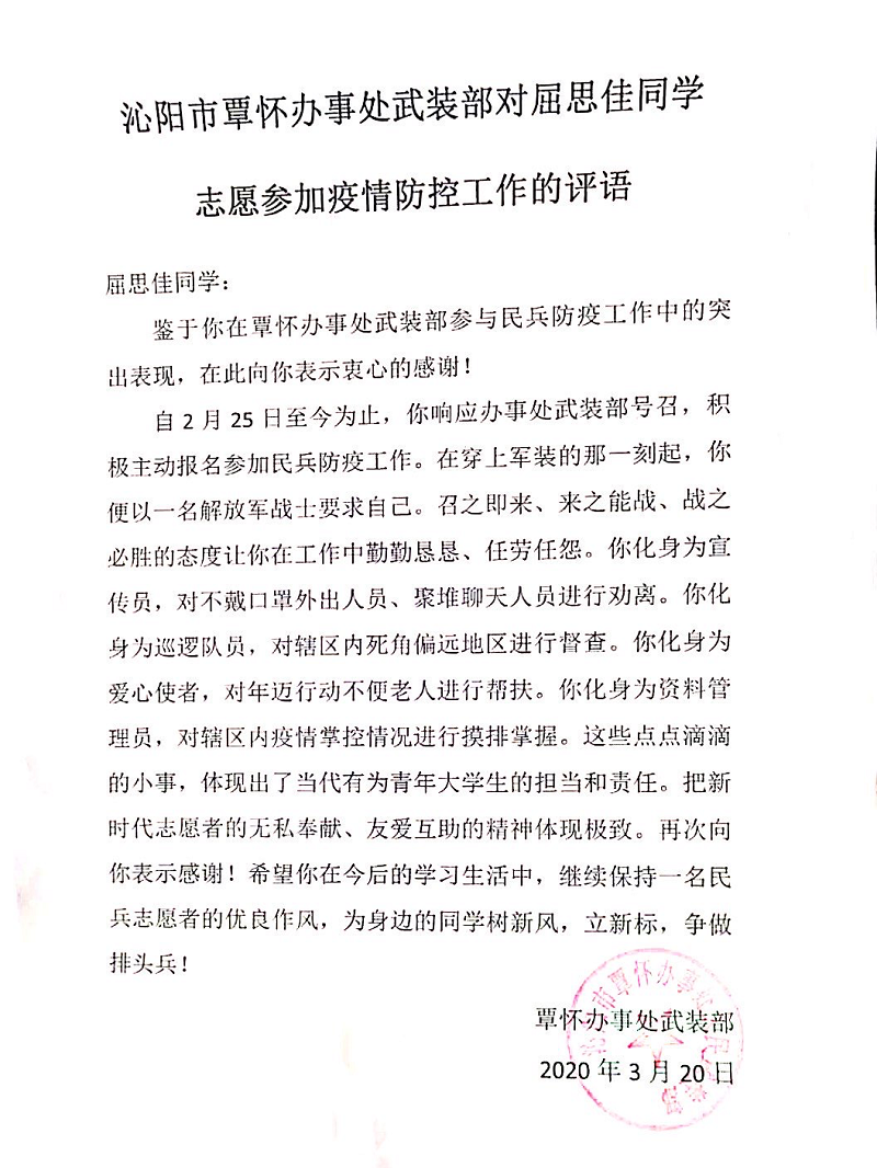 近日,沁阳市覃怀办事处武装部发来感谢信,对我校太阳成集团tyc334552019级宠物医学01班学生屈思佳同学在家乡疫情防控工作中的突出表现予以表彰和感谢。
