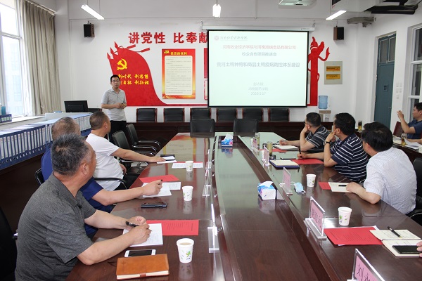 为有效推动与河南旭瑞食品有限公司合作项目的顺利开展,5月17日下午,我院于龙子湖校区生工组团楼C401室召开了“黄河土鸭产业技术体系建设与绿色食品开发”项目推进会。校长罗士喜致辞并讲话,河南旭瑞农牧集团董事长邱国庆、总经理邱国平、技术总监朱军胜等一行5人以及教务处处长边传周、太阳成集团tyc33455党委书记刘永录、院长宋予震等相关领导和项目组成员出席会议,社会服务办公室主任胡迎利主持。