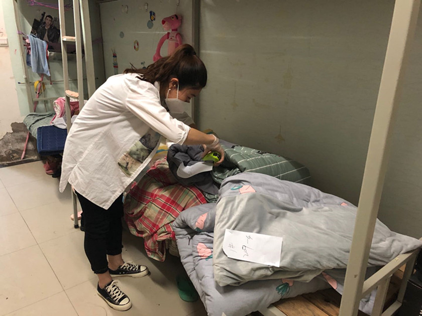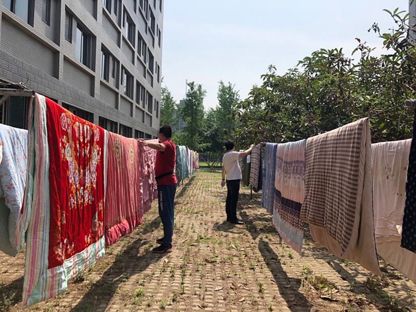 进入宿舍后,首先对寝室进行开窗通风,将部分学生寒假前尚未整理好的被褥、湿潮被褥进行晾晒,大家分工明确,擦栏杆、取被子、贴标签、晒被子、回收等形成一整套流程,为同学们晒被子、收被子、叠被子,齐心合力让学生的被子既晒太阳、又保持干净,每床被子都需要晾晒一天,最后物归原位。