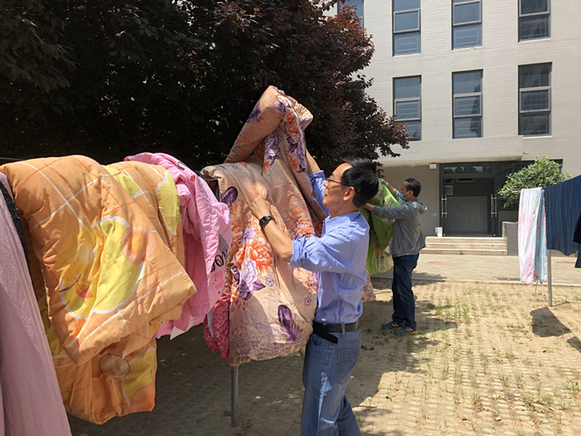 疫情延长了同学们返校的时间,但阻隔不了太阳成集团tyc33455对学子的关心关爱。为了学生返校后能有一个舒适的环境,学院于5月15日开启一场“暖心晒被”行动,我院全体辅导员在院党委书记刘永录和院党委副书记汪洋的带领下,深入学生宿舍为即将返校的学生晾晒被褥,以温暖有爱的实际行动迎接同学们复学。