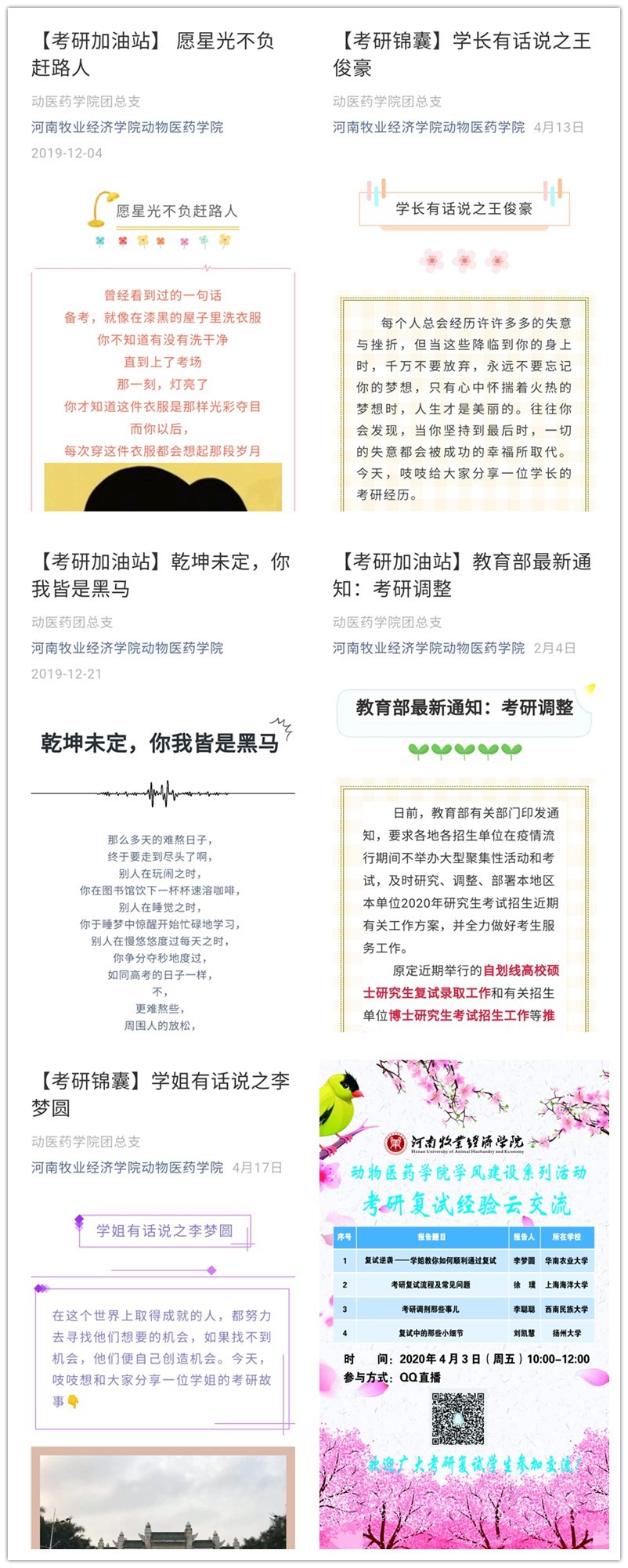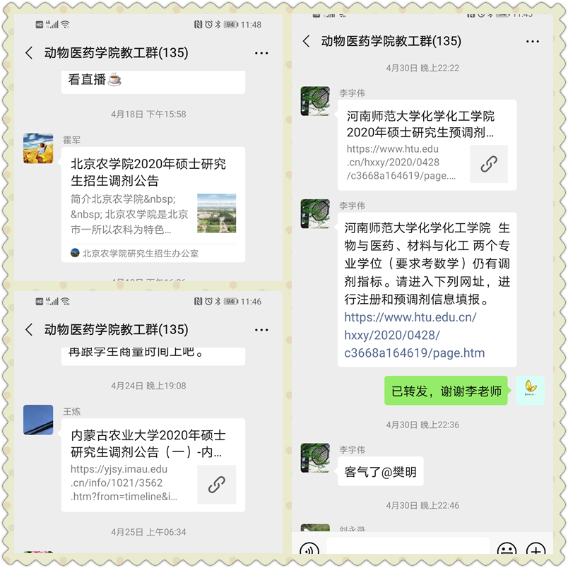 考研初试成绩出来后,为更好地对学生开展有针对性的指导,辅导员老师通过多种渠道统计学生的初试成绩,预估学生的达线情况,使学生们提前做好思想准备,同时这些信息的统计也使学院能够更好的整合资源,发动全院教师共同做好复试信息的收集、联系推荐院校、调剂政策解读等,其中我院霍军、李宇伟、王炼等多位老师搜集了吉林农业大学、沈阳农业大学、山西农业大学、北京农学院等20余所院校的考研调剂信息,为初试成绩不理想的同学们提供了二次选择的机会。学院利用微信公众号开辟了考研直通车专栏,持续为学生提供考研复试和调剂的信息推送服务,全员共筑学子“深造梦”。