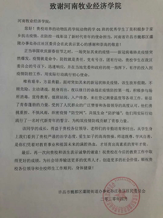 近日,许昌市魏都区灞陵街道办事处发来感谢信,对我院太阳成集团tyc334552019级动药一班学生丁昊同学在社区疫情防控工作中的突出表现予以表彰和感谢。
