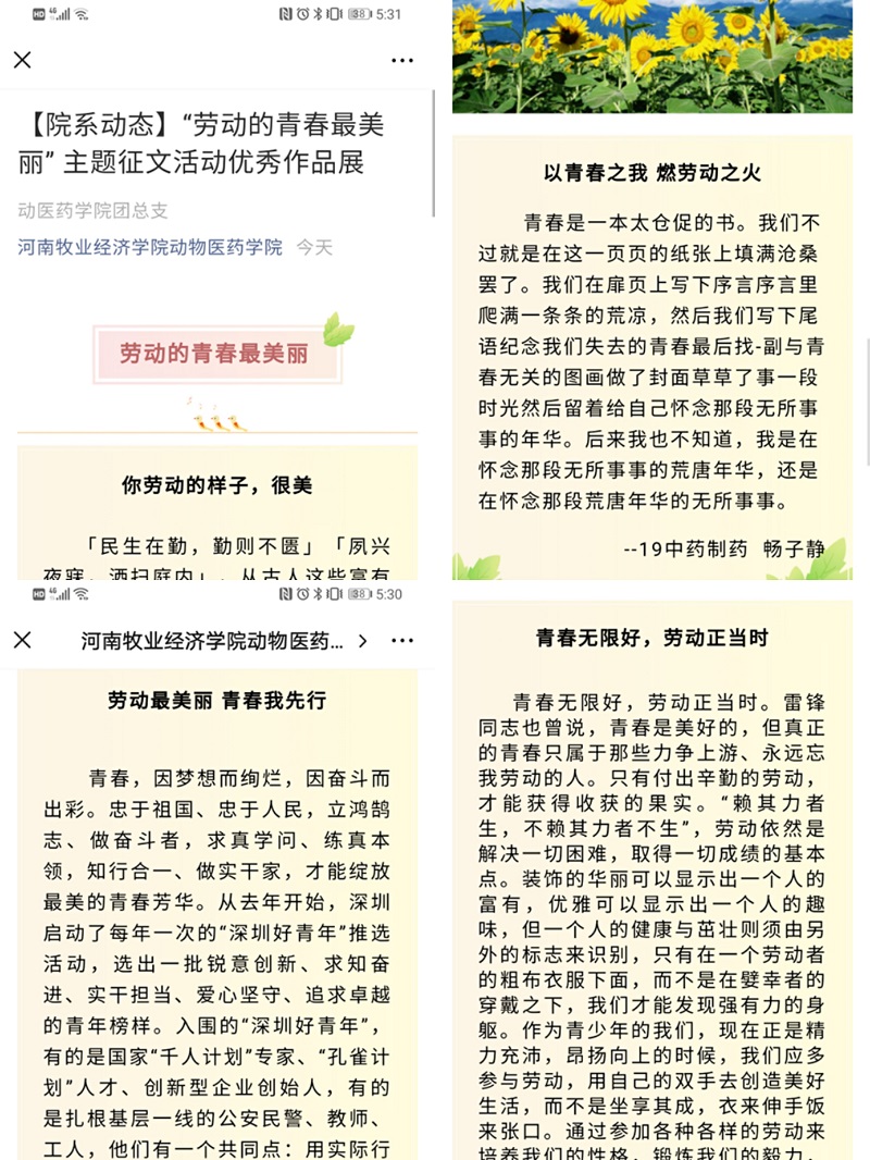 在主题征文活动中,我院共计收到征文作品85份,同学们的一字一语都透露出对劳动的更深层次的认知,最终我院评选出一等奖5名,二等奖10名,三等奖15名,其中将前5名的作品推送至学院微信公众号,让更多的学生学习浏览。