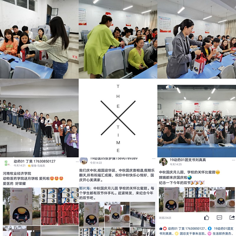 月饼发放后,同学们纷纷拍照以各种形式表达了喜悦和感恩的心情,其中18级的张梦豫说:“我们庆中秋,祖国迎华诞,中秋国庆喜相逢,所有祝福汇成篇!”19动药01班的刘真真说:“中秋国庆月儿圆,学校的关怀比蜜甜!”这一句句发自内心的话语,是同学们对学校关怀的最好回应,不得不说这个节日有点甜。