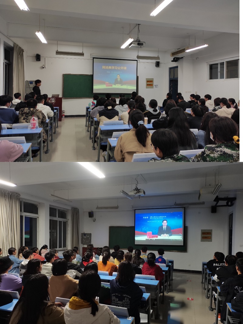 专题学习采用集中学习和自学观看为主,我院组织师生分别以教研室、党支部、班级、宿舍为单位开展集中学习。公开课上,中国人民大学常务副校长、中国法学会民法学研究会会长王利明讲解《民法典的中国特色、实践特色和时代特色》,全国人大常委会法工委副主任刘俊臣讲解《关于民法典的几个主要问题》,最高人民法院审判委员会副部级专职委员刘贵祥讲解《民法典与社会生活密切相关的几个问题》,权威解读民法典的重大意义,阐释民法典的核心要义和重点问题,为民法典学习宣传提供重要参考。