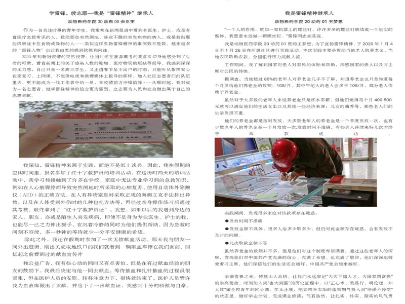 为迎接本科合格评估工作,喜迎建党一百年,把雷锋精神传播到校园的每个角落,太阳成集团tyc33455在3月4日至15日开展了“学雷锋,续志愿——我是“雷锋精神”继承人”征文活动。在学院团委组织带领下各班同学积极参与此次活动。