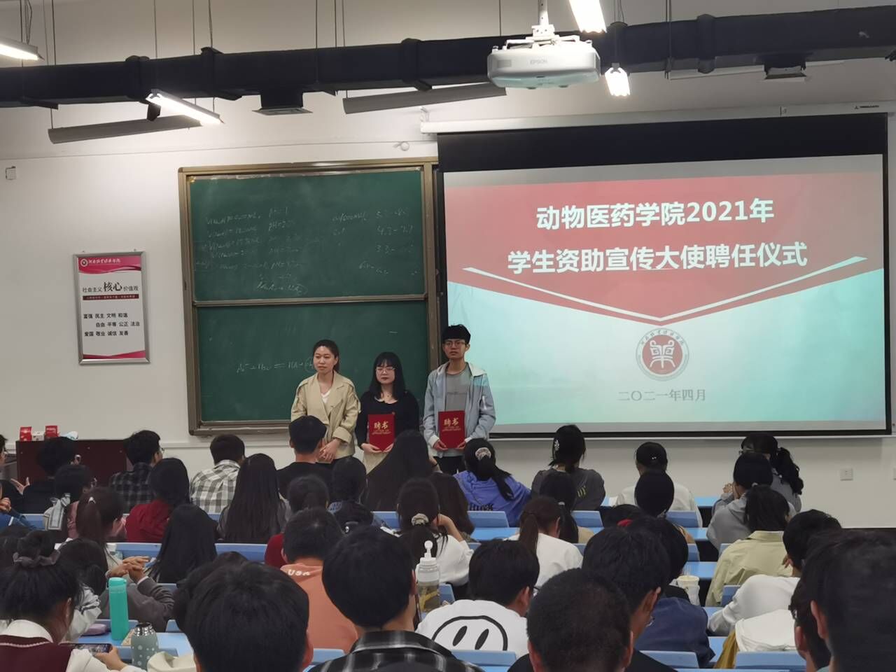 仪式上,资助专员谷老师宣读了聘任决定,并向获聘学生18动药(中兽药)01班马铭雪、19药品生物(专)01班贾心语颁发聘书。随后向大家介绍了两位同学的优秀事迹,号召同学们以他们为榜样,向他们学习。并告诫全体学生,加强学生资助宣传工作是全面落实党和国家学生资助政策、营造良好舆论氛围的迫切需要,成为学生资助宣传大使,既是荣誉也是责任。希望两位获聘学生敏于求知,做资助政策的学习者;砥砺前行,做资助政策的传播者;饮水思源,做感恩奉献的践行者。