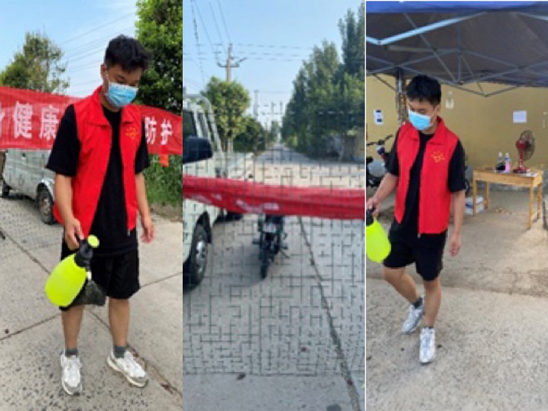 2020级动医03班的杨忠宇同学,他主动报名担任防疫志愿者,在濮阳市台前县农业农村局所防控的种子公司家属院志愿进行疫情防控宣传排查。他主要负责进出人员测体温、健康码查询、登记返乡人员等工作,为小区居民提供服务,为医务工作者减轻负担,始终坚守在疫情防控第一线。杨忠宇同学表示:面对新型肺炎再次凶猛来袭,有一分热发一分光。志愿者的意义在于无私奉献,不怕苦不怕累。瘟神纵恶祸人间,系念苍生力恨艰,成城众志破难关。我坚信,众志成城,战“疫”必胜!