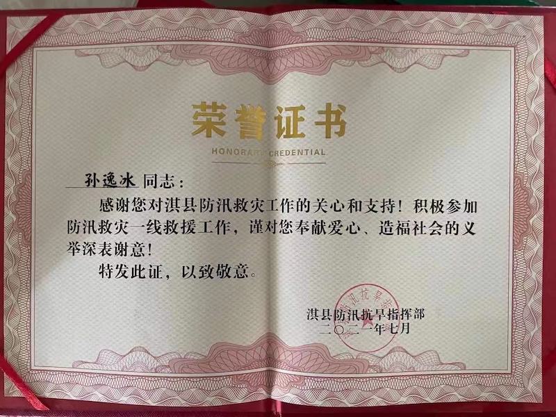 近日,太阳成集团tyc33455收到淇县防汛抗旱指挥部为20动医升本02班孙逸冰同学颁发的荣誉证书。证书中对孙逸冰同学积极参加淇县防汛救灾一线救援工作表示高度赞扬和感谢。