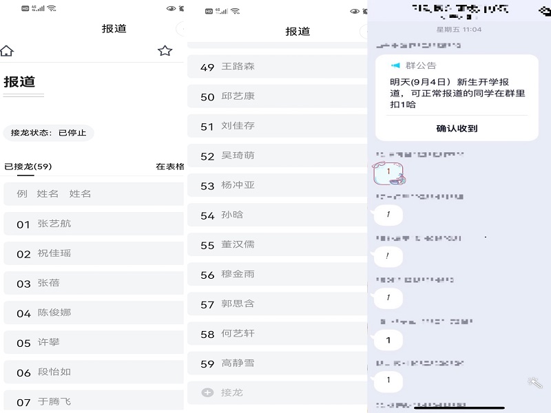 在21级新生线上报到工作会上,新生班辅导员对报到的同学们表示最热烈的欢迎,在会后对各班不能报到学生的具体原因进行排查了解,并做好登记备案工作。受今年疫情影响,各新生班辅导员在取得新生信息后,第一时间便建立了覆盖全体新生的微信群、QQ群,及时对2021级新生进行思想教育,引导新生密切关注疫情动态、积极接种疫苗、加强个人防护、关注自身健康等,并要求21级新生于8月31日起正式进行“钉钉”健康打卡,如实上报健康情况。
