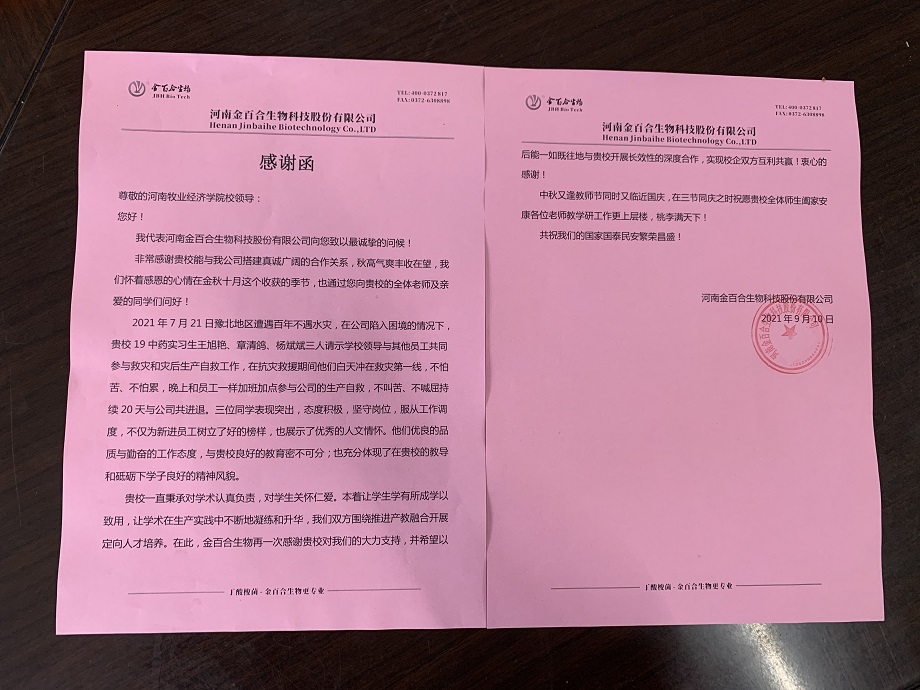 9月13日,河南金百合生物科技股份有限公司运营总监郭静来到我院,将一封充满深情的感谢信和一面写有“名师指导共育一代新人校企联合共筑产业辉煌”的锦旗亲自送到了学院领导手中。我院党委副书记汪洋接受了锦旗,并对河南金百合生物科技股份有限公司赠旗表示感谢。我院党委副书记汪洋和实习指导老师王笃学一同与郭总进行了交流。