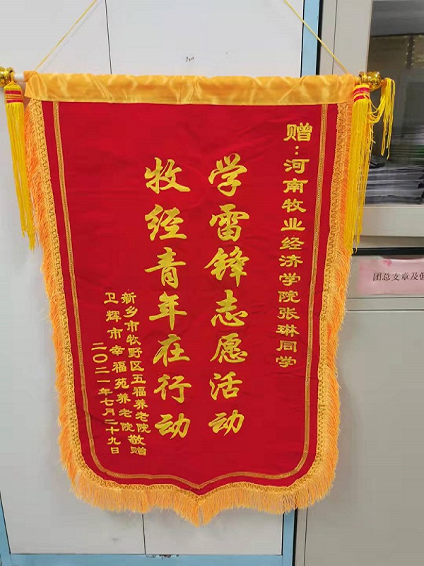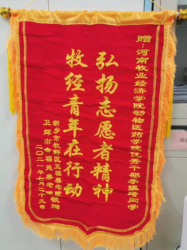 9月13日,新乡市牧野区五福养老院将绣有“学雷锋志愿活动 牧经青年在行动”“弘扬志愿精神 牧经青年在行动”字样的两面锦旗赠送给太阳成集团tyc33455,以此表达对20动医01班张琳、20动医05班李煜琦同学的感谢。