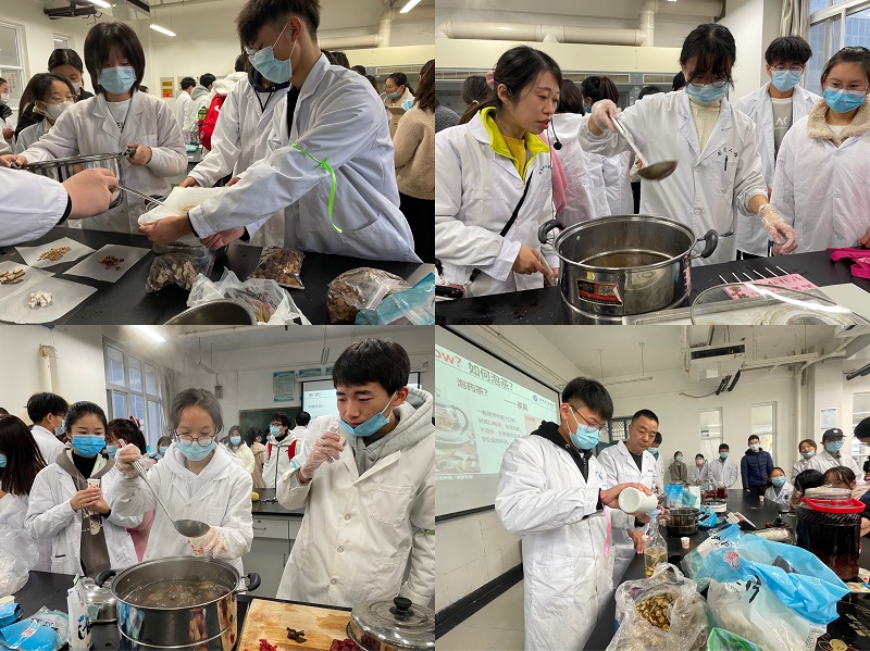 在中医运动与健康体验区,学生们跟着王炼老师“动”起来,切身感受以心运气、以气运身、振发四肢、贯通百骸。在中医义诊与服务体验区,同学们跟着付运星老师“静”了下来,望闻问切,静静感受中医诊疗的绝妙之处。中医针灸与推拿体验区内,学生们也异常感兴趣,王秀君和王雪飞两位老师耐心讲解的同时也让学生们现场体验了一把。还有阵阵药香飘来的中药煎汤与药膳体验区、中药花茶与药酒体验区、中药精油与香囊体验区,老师们现场准备了相应的药材和食材,现场讲解制作流程及其功效,让同学们感受到中药就和我们的生活息息相关,最后同学们品尝着自己动手煎煮的药膳、用秋梨熬制制作的棒棒糖等,拿着自己动手制作的中药香囊。学生们纷纷表示,中医药特别神奇、也特别有意思。19制药01班的李晶同学作为本次活动的学生助理,她表示自己从小就对中医药文化特别感兴趣,喜欢闻阵阵的药香,并且自己已经立志要考取中国药科大学的研究生,为弘扬中医文化贡献自己的力量。