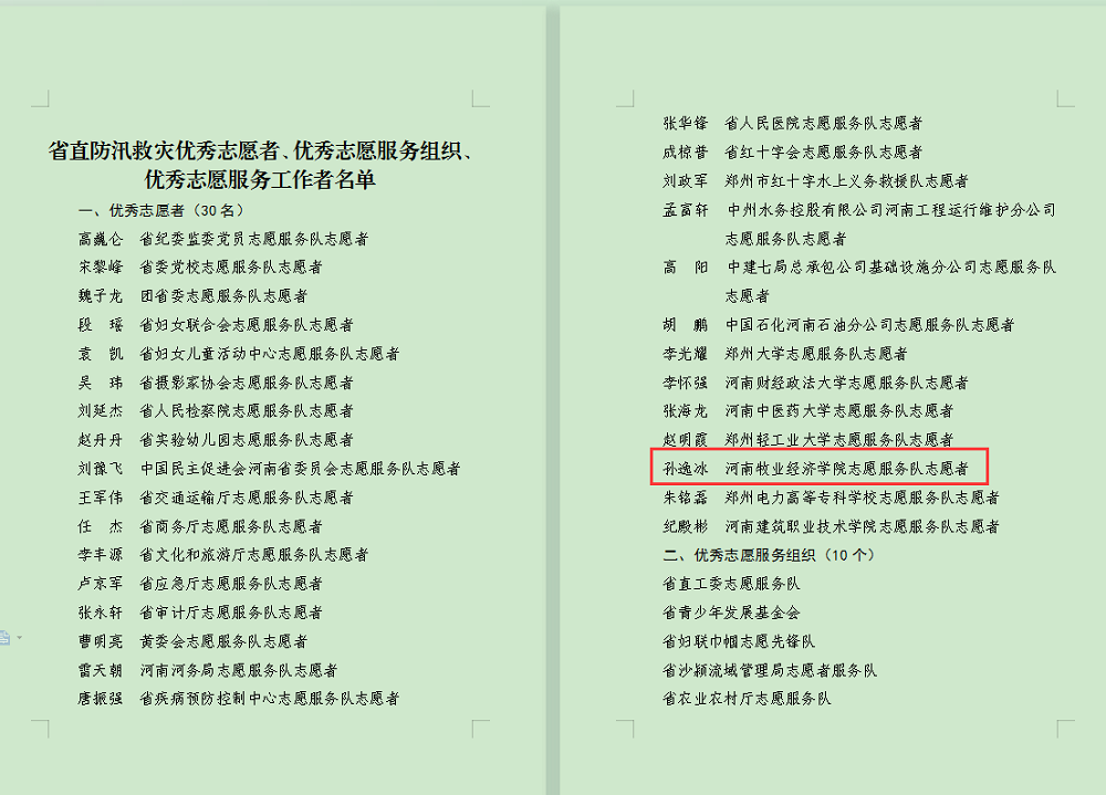 为广泛学习宣传防汛救灾中优秀志愿服务先进典型的感人事迹和崇高品德,省直文明办开展了河南省防汛救灾志愿服务先进集体和个人的宣传推选活动。经各省直单位遴选推荐、资料审核、专家评审等环节,我院2020级动医(专升本)02班孙逸冰同学获得“优秀志愿者”称号。