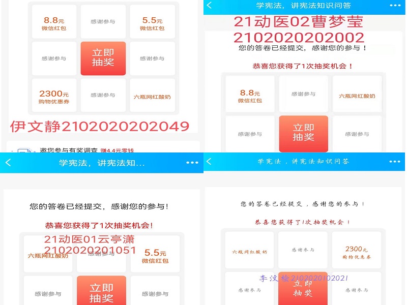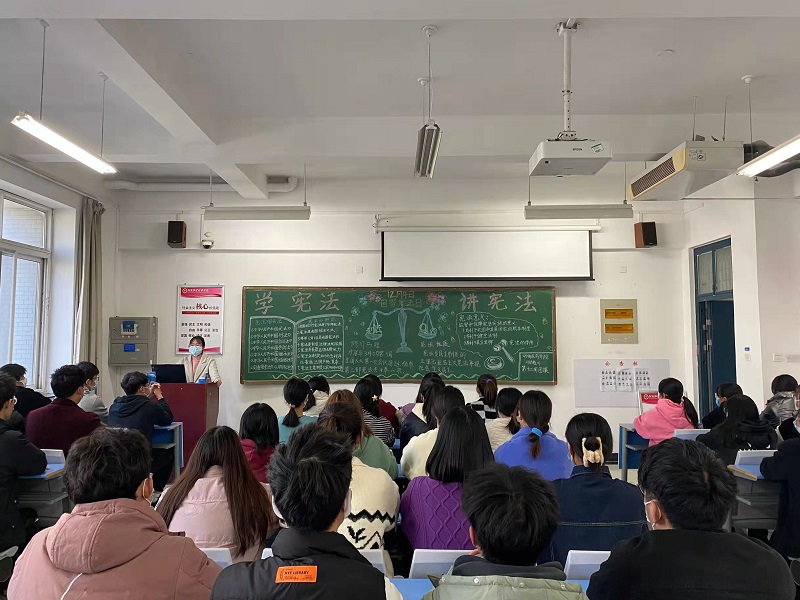 2021年11月24日、25日,我院组织学生开展“学宪法、讲宪法”线上知识问答和线下主题团课活动。知识问答活动面向2020级和2021级学生,以问卷星为媒介,由学习部负责出题、组织作答和收集截图。通过知识问答巩固宪法知识,激起了大家的学习热情。11月25日,2021级学生以班为单位开展“学宪法,讲宪法”为主题的团课活动。活动开展期间,首先,各班通过PPT演示、播放相关微视频等方式让同学们了解了宪法底蕴厚重的发展史,与其对我国建立社会主义法治社会的里程碑式意义。其次,主持人紧随当下法治实施热点,阐述宪法在实际解决社会法治问题时的高度权威性、公平性,讲述了宪法对国家、对社会、对人民的意义。最后,大家举手踊跃发言,分享身边的事例,讲述自己对宪法的理解和感受。大家纷纷表示要从身边小事做起,从一点一滴做起,势必将宪法精神内化于心、外化于行。