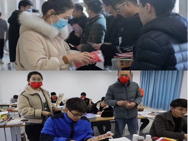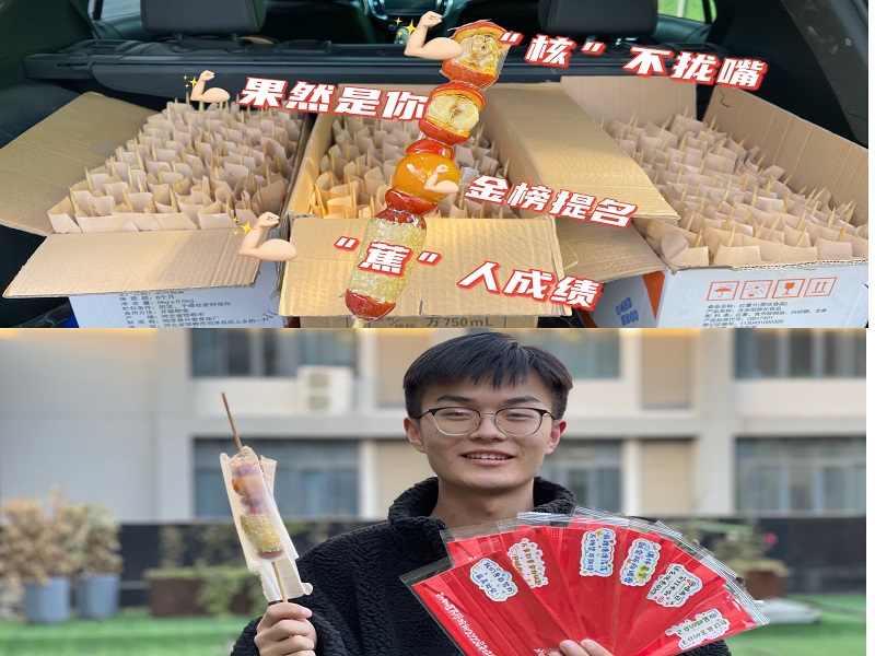 “考研加油包”包含两个定制口罩和一串饱含寓意的糖葫芦。疫情常态化背景下,学院为每个考研学生准备了两个定制口罩,口罩上印有“太阳成集团tyc33455祝2022届考研学子成功上岸”的字样,上面贴有写着祝福语的精美贴纸,“前路浩浩荡荡,万物皆可期待”、“满怀希望就会所向披靡”、“熬过最苦的日子,做最酷的自己”,写下了我院师生对于考研学子的祝福。糖葫芦由核桃、坚果、金桔和香蕉穿成一串儿,坚果寓意“果然是你”,借香蕉、金桔、核桃的谐音祝福考研学子们都能考出“蕉”人成绩,金榜题名,笑的“核”不拢嘴。“20211202”—在这个正也顺、反也顺的好日子,收到“考研加油包”,现场不少考研学子表示,“有心了。”“太暖心。”“我们也是别人家的学校了!”