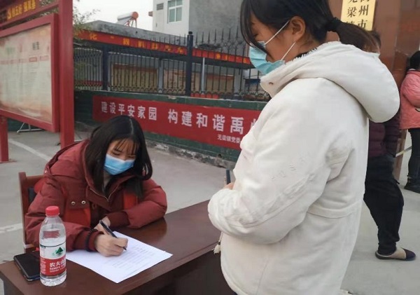19动药02班的王苗,家住洛阳市新安县学林社区。疫情来临时,她积极加入志愿者行列,主要工作是对学林社区归属的家属楼进行挨家挨户式的入户排查,核对每一个从中高风险区返乡的人员信息,指导他们填写表格,进行登记,并通知他们按照要求做核酸检测,同时对家庭其他成员解读防控措施,宣传居家观察、卫生防疫等科学知识。其次是在两天一测的核酸检测工作中,维持秩序,指引他人扫描采样码、登记信息等。王苗同学现在已经连续参加志愿活动近一个星期,虽然工作枯燥并有一定的风险,但她依旧表示,这段时间的经历使她终身难忘,她要坚持下去,直至全民抗疫迎来胜利的那天!