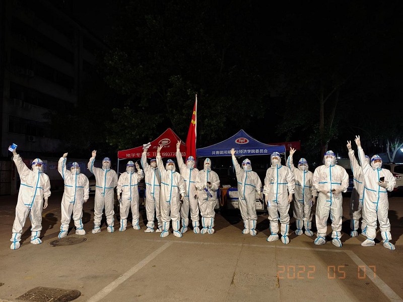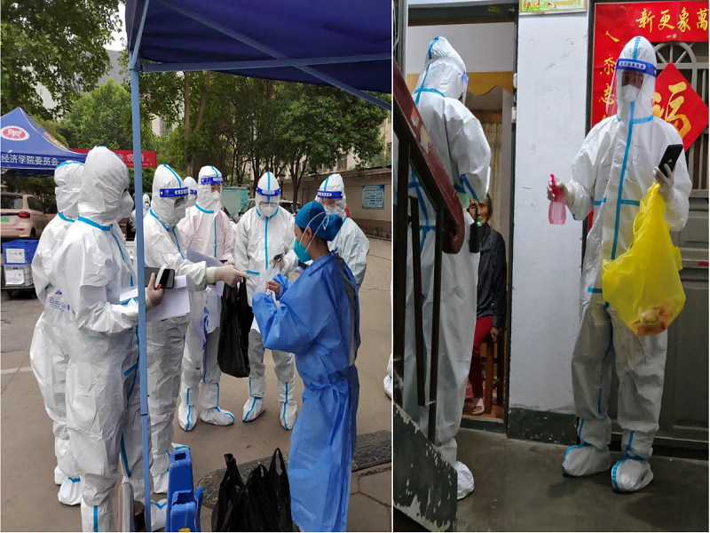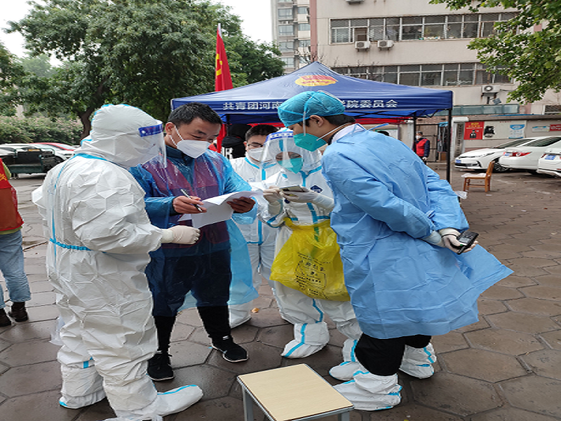 核酸检测是目前发现病毒、防控疫情的最有效、最有力手段。为确保核酸检测高质量完成,我院志愿者吴玉臣、汤法银、李宇伟、乔宏兴、王岩、侯春彬等教师多次参加登门入户、扫码登记、安抚劝导、协助医护人员开展核酸检测等工作,并与前期排查的信息及进行核实,确保核酸检测不漏一人。核酸检测多在凌晨进行,此时有些业主还在熟睡,志愿者需要喊话敲门,确保住户全员核酸检测。有些业主对频繁核酸检测有所抗拒,但在志愿者的耐心解释下,业主从抗拒变成了主动接受,并能充分体谅我们的工作。核酸检测时穿着的防护服密闭性好,志愿者经常全身被汗水湿透,防护罩被汗水浸湿形成水雾笼罩。