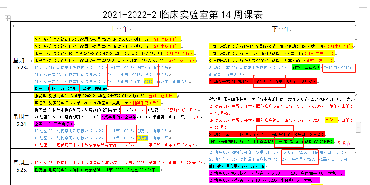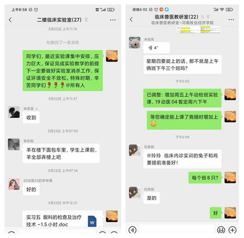 实验中心主任程茂高迅速组织开展全面协调工作,开展实验室安全检查和消杀工作,协调实验动物和耗材以及实验安排等工作;负责预防兽医实验室郭素琴老师手机使用到发烫,没电了边充电边联系协调,一直持续到深夜;负责临床兽医实验室刘玲玲老师还在隔离观察期间,面对实验动物协调供应,多课头和实践周协调安排,以更优化的方式保障实验课的开展;负责基础兽医实验室史洪涛老师早上六点多赶到实验室,安排协调接下来的工作,协助分担处理暂未能返校的实验老师工作......面对繁重的常规实验教学任务和实训周,实验中心各实验员与教研室协同,能返校的教师全员上阵,充分发挥课程团队团结协作,代替无法返校教师上课,全院实验室统筹协调利用,保证实验课的及时开展。
