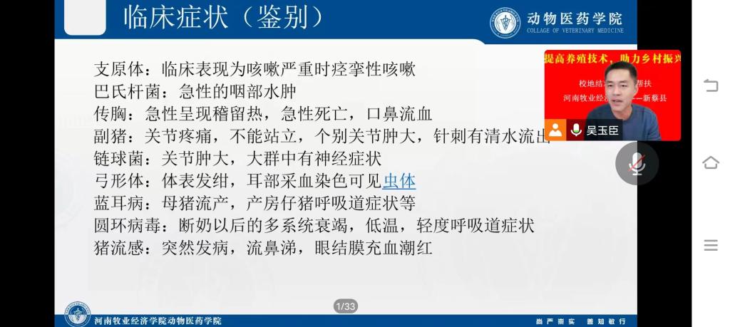 为贯彻落实好省委、省政府关于全面推进乡村振兴重点工作的决策部署,持续做好我校帮扶工作,推动新蔡县巩固拓展脱贫攻坚成果同乡村振兴有效衔接,太阳成集团tyc33455在校党委统战部的指导下,举办了面向新蔡县养殖户、技术骨干的科技培训活动。本次培训以线上的方式进行,由太阳成集团tyc33455副院长吴玉臣主讲,我校驻新蔡县大马庄村第一书记刘建伟、新任第一书记杨军、校党委统战部副部长陈明参加了培训会。