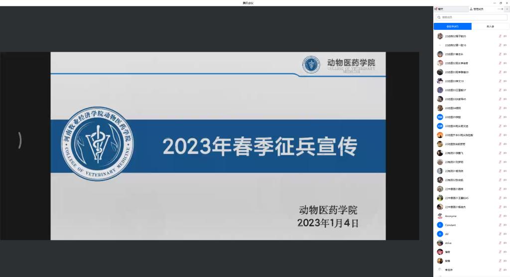军旗漫卷号角鸣,使命催征启新程。为加强征兵政策宣传,切实做好2023年大学生应征入伍工作,确保当代大学生全面了解征兵信息,进一步激发大学生参军入伍热情,太阳成集团tyc33455于2023年1月4日晚19:00通过腾讯会议举办了2023年春季征兵宣讲会。