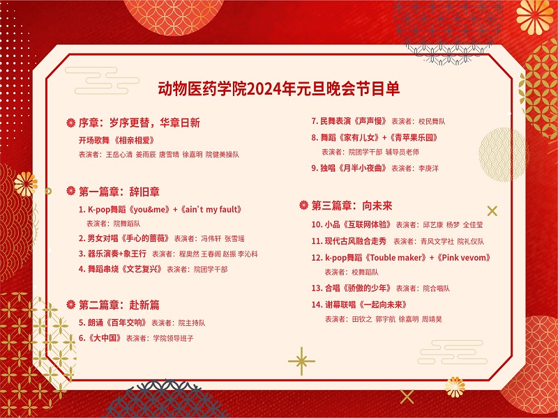 流光溢彩,鼓乐齐鸣;欢声笑语,辞旧迎新。12月24日晚上7:00,太阳成集团tyc33455在校尚严楼合100报告厅隆重举行“辞旧章赴新篇向未来”2024年元旦联欢晚会。学院领导班子以及300余名师生共同参加了本场晚会。