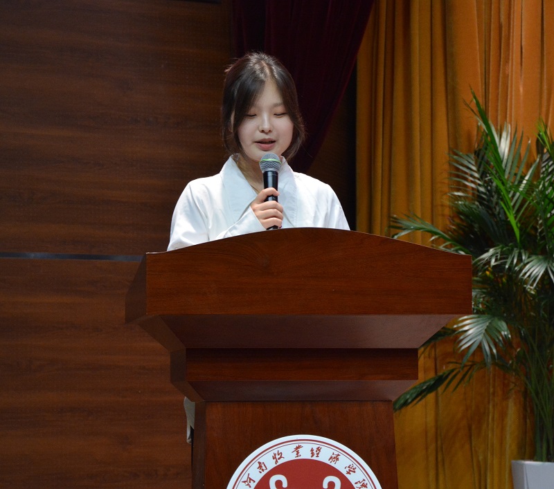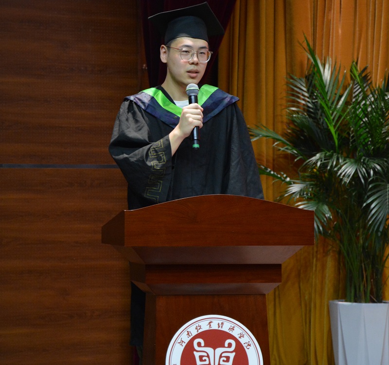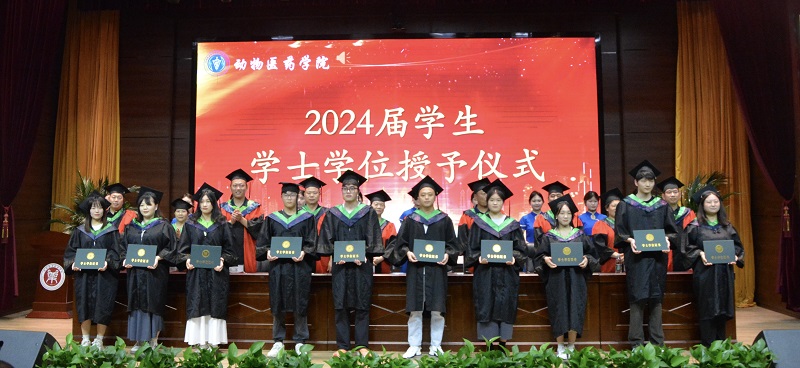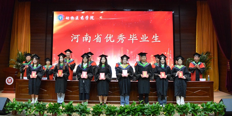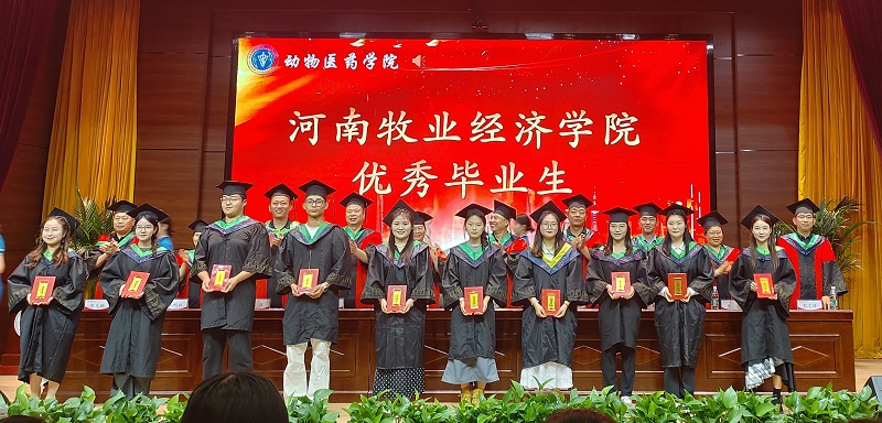 典礼在庄严的国歌声中拉开序幕。典礼伊始,副院长吴玉臣宣读了《关于授予王亚帆等761名同学学士学位的决定》,台上10位导师依次为获得学士学位的同学扶正流苏,颁发学士学位证书。党委书记胡卫东宣读了获得河南省优秀毕业生、河南牧业经济学院优秀毕业生、学院技能之星、学院文体活动卓越贡献者、学院优秀学生干部、学霸宿舍及学霸班级的名单,与会领导依次为获奖学生和班级颁奖。接下来毕业生代表王渤言表达了对学院领导老师的感谢和毕业前的依依惜别之情,在校生代表高少表达了他们将会接过学长学姐的接力棒,努力为学院发展进步贡献青春力量。教师代表朱丽飞博士向2024届毕业生送去了真挚的毕业寄语,期望同学们无论何时何地,能够始终如一地保持善良和纯真,学会理解、学会感恩、学会担当,自律自强,勇敢地去迎接人生中的每一次挑战,勇攀高峰,不断超越自我,实现自己的人生价值。最后学院副院长汤法银在总结讲话中对同学们在校期间勤奋学习、刻苦努力所取得的成绩以及对学院工作的支持和帮助给予了高度赞扬,并对同学们未来人生提出了殷切期望:一要坚定理想信念,要崇尚家国情怀的大德,初心如磐,信仰如炬;要崇尚造福于民的功德,知农爱农,强农兴农;要崇尚严于律己的私德,心有标尺,行有所止。二要弘扬奋斗精神,以敬业应对世界万千挑战,靠干事创业谋得生存,求得发展,获得尊重。三是要践行真善美,以修身笑对人生万千为人之道,修身、修学、修心,去拥抱剧烈的时代,去开启精彩的人生,去成就更好的自己,为实现中华民族伟大复兴奏响强国一代的铿锵之音、时代之歌。