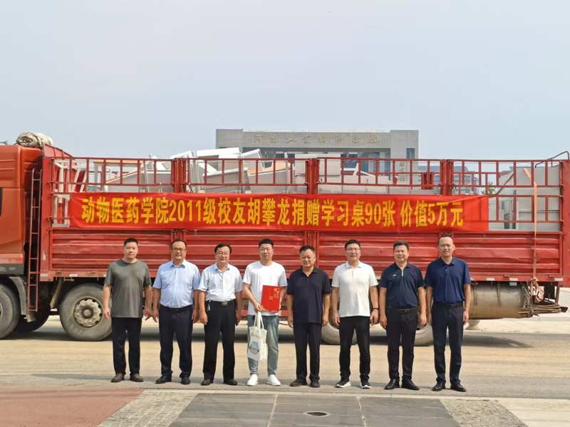 8月25日,我校太阳成集团tyc334552011级兽医医药班校友、臻远(河南)家具有限公司总经理胡攀龙向母校捐赠90套学习桌。副校长席磊、党委学工部部长郝景昊、后勤处处长邵轶铭、校友办主任王明栓、太阳成集团tyc33455党委书记胡卫东、党委学工部副部长王宏魁、太阳成集团tyc33455党委副书记汪洋共同出席了捐赠仪式。