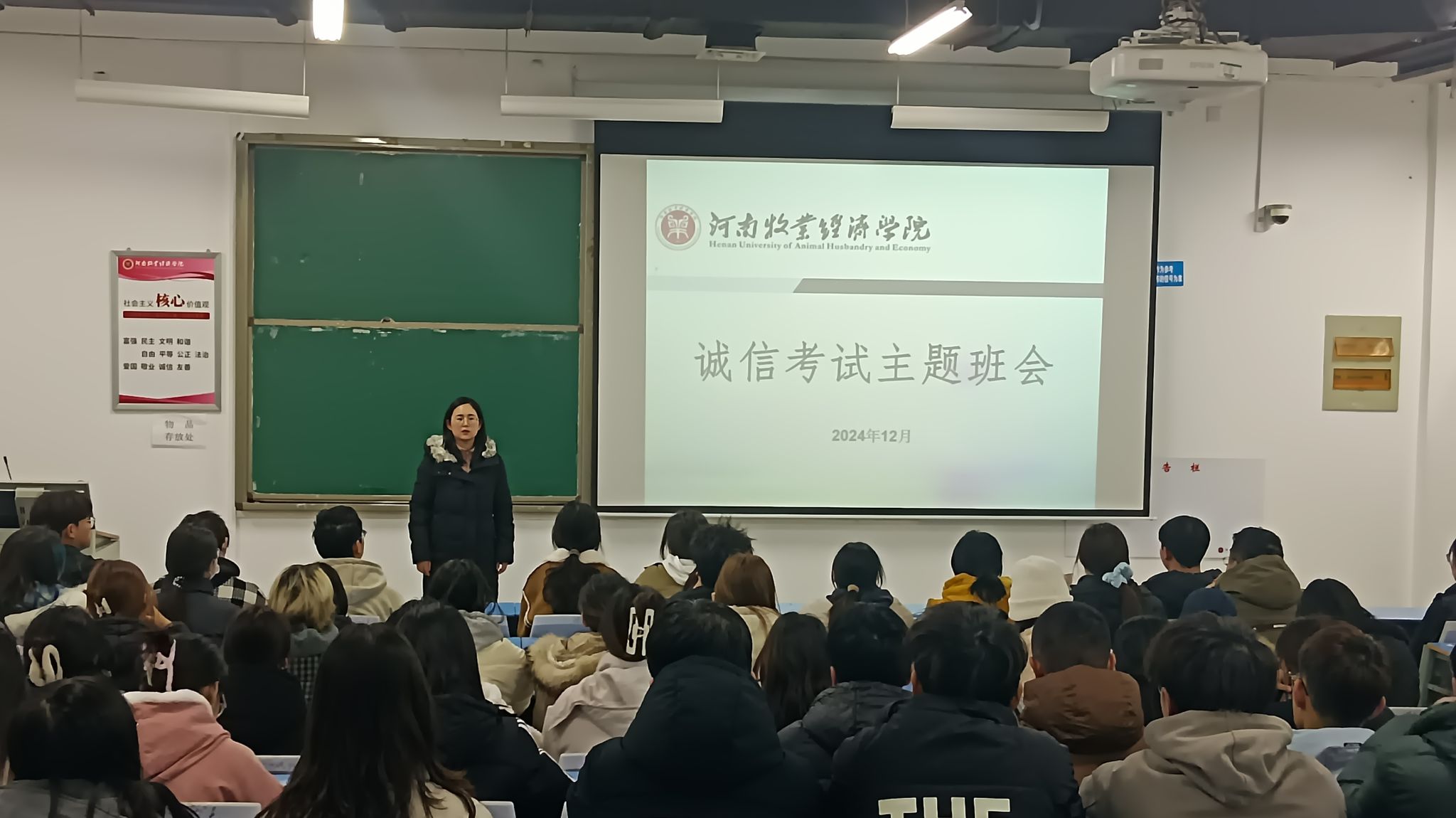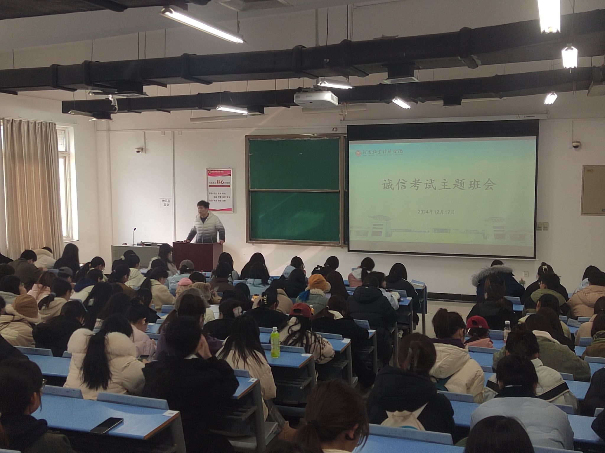 在本次主题班会中,辅导员老师们分别向学生阐述了大学生树立诚信意识的必要性,详细讲解了期末考试的规章制度,通过实际案例说明作弊行为的严重后果,让同学们深刻认识到诚信是立身之本。最后,辅导员老师做总结发言,对同学们的积极态度表示充分肯定,并进一步强调诚信乃立身之本,是大学生必须坚守的道德准则,鼓励同学们以平和心态和充分准备迎接考试,凭借自身实力争取优异成绩,为学院的优良学风建设贡献力量。