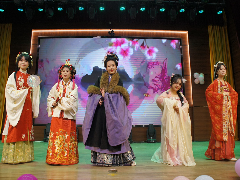 晚会在学院啦啦操队热情洋溢的舞蹈《OH》中拉开序幕,同学们以充满活力的舞姿瞬间点燃了现场的热情。紧接着,一系列精彩纷呈的节目轮番上演,为观众带来了视觉与听觉的双重享受。任欢老师献唱歌曲《节日欢歌》,欢快的旋律和充满力量的歌声传递出对大家的美好祝福和对新年的殷切期望。街舞队的《Guaya》则以动感的节奏和震撼的舞蹈动作,赢得了现场观众的阵阵掌声。清风文学社的汉服展示《汉韵华裳》更是将观众带入了传统文化的殿堂,展现了汉服的独特韵味与华美风采。