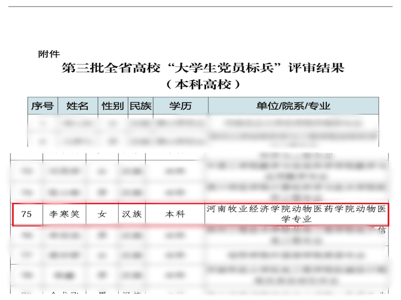 为深入学习贯彻习近平总书记关于青年工作的重要论述精神,进一步加强大学生党员队伍建设,发挥优秀大学生党员标杆作用,营造“学先进、赶先进、当标兵”的浓厚氛围,中共河南省委教育工委、河南省教育厅近日公布了第三批全省高校“大学生党员标兵”选树结果。经基层党组织推荐、学校专家评审、校党委研究审议、省级评选等环节,我院2022级动物医学专业学生李寒笑凭借过硬的政治素质和突出的先锋事迹,成功获评“河南省大学生党员标兵”荣誉称号。