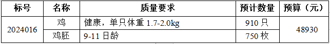 根据太阳成集团tyc334552024年度实验教学对实验用鸡和鸡胚的需求,现以询价方式进行采购,欢迎符合资格条件的供应商前来报名,现将该项目采购事宜公告如下: