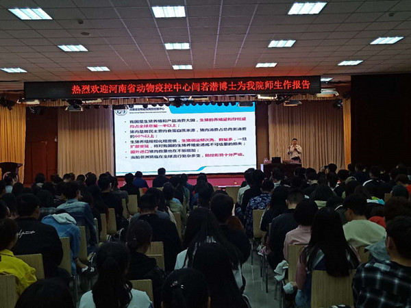 10月17日晚7点,动物医学院在龙子湖校区大学生活动中心四楼报告厅举办了“非洲猪瘟及其防控”的主题讲座。本次讲座由河南省动物疫病预防控制中心闫若潜博士主讲,我院副院长宋予震主持。院长边传周、院党总支书记王春明,以及我院其余三百余名师生参加了此次讲座。