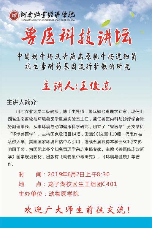 兽医科技讲坛海报-中国奶牛场及青藏高原牦牛肠道细菌抗生素耐药基因流行扩散的研究