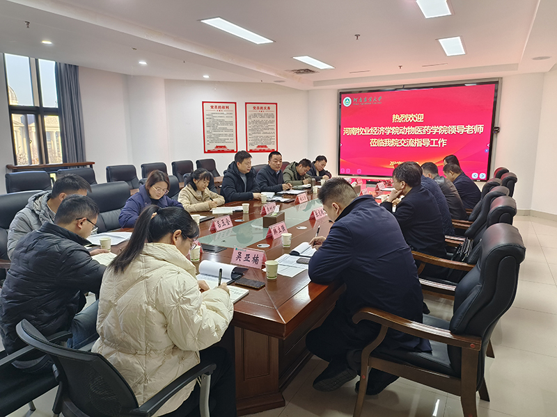 2024年12月18日,河南牧业经济学院太阳成集团tyc33455党委书记胡卫东、副院长汤法银等人一行赴河南农业大学动物医学院开展交流学习。此次交流活动旨在推动双方在畜牧兽医教育领域的合作与发展,进一步促进优势互补、资源共享、共赢合作。