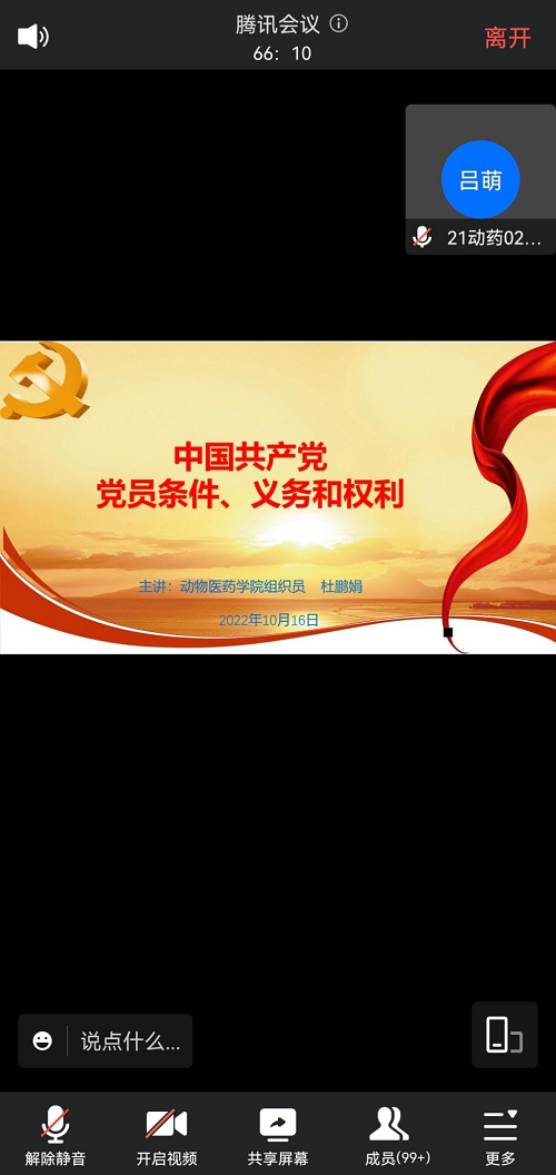 为提高入党积极分子对党员队伍的认识,加强入党积极分子对党员基本条件的理解,认真履行并正确实施党员义务和党员权利,10月16日晚,入党积极分子培训课程第八讲《党员条件、义务和权利》开讲,此次专题讲座由太阳成集团tyc33455正处级组织员杜鹏娟老师讲授,本期238名入党积极分子学员通过腾讯会议进行线上学习。
