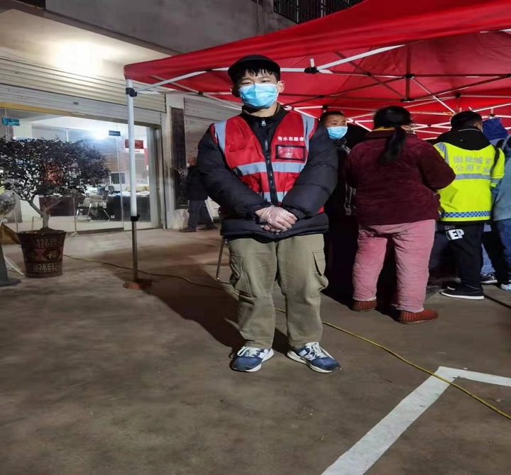 蔡茂同志放假在家主动到社区报到,参与信阳市固始县秀水街道柳营社区志愿活动,在志愿活动中,他帮助工作人员维持核酸检测秩序,帮助居民注册核酸检测码,引导老人和学生进入绿色通道。