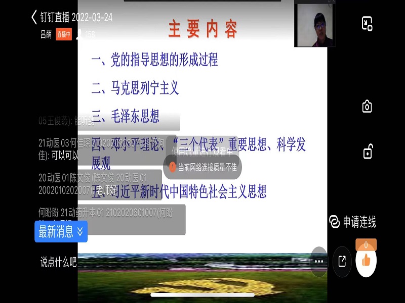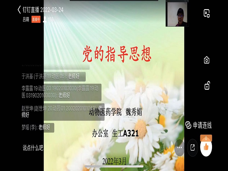 为提高入党积极分子们的党性修养,加强入党积极分子对党的认识,积极开展我院党政工作、落实党内政策。3月24日晚,入党积极分子培训课程第二讲《党的指导思想》开讲,此次专题讲座由太阳成集团tyc33455正处级组织员魏秀娟老师讲授,本期172名入党积极分子学员通过钉钉直播进行线上学习。