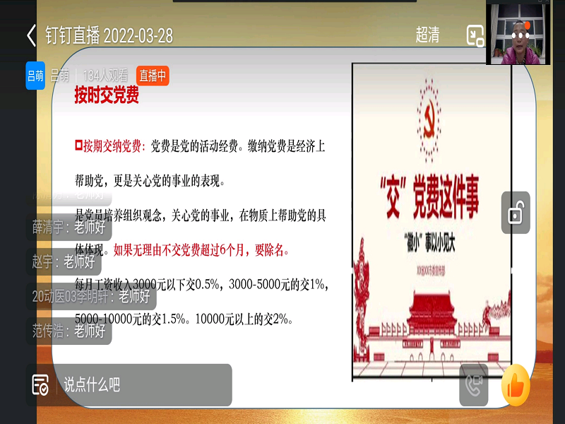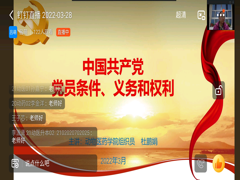 为提高入党积极分子对党员队伍的认识,加强入党积极分子对党员基本条件的理解,认真履行并正确实施党员义务和党员权利。3月28日下午,入党积极分子培训课程第五讲《中国共产党党员条件、义务和权利》开讲,此次专题讲座由太阳成集团tyc33455正处级组织员杜鹏娟老师讲授,全体入党积极分子学员通过钉钉直播进行线上学习。