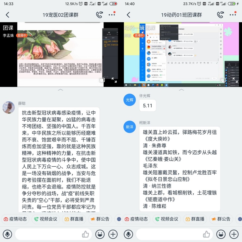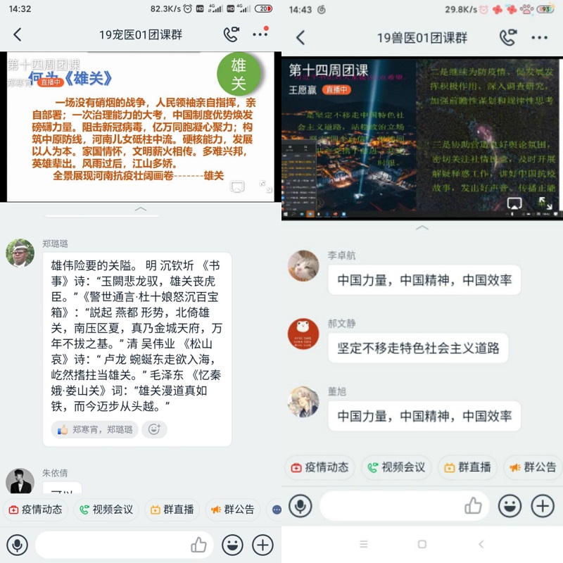 5月14日下午2:30,我院组织19级各班在钉钉团课群中开展以“中原抗疫勇担当,众志成城铸雄关”为主题的团课学习活动。